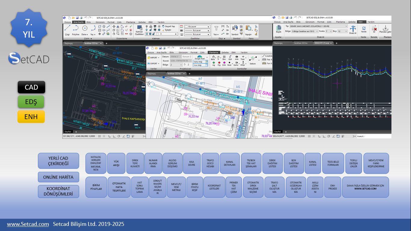 SETCAD EDŞ , ENH yerli CAD çekirdeği üzerinde geliştirilmiş yeni nesil Elektrik dağıtım Şebeke çizim programıdır. Bu programla havai veya yeraltı AG, OG, ENH projelerini tek bir ara yüzle çizebilir, dwg, dxf gibi farklı dosya formatlarına çevirebilir, tüm hesap detayları ve birim fiyatlı keşif özeti alabilirsiniz.